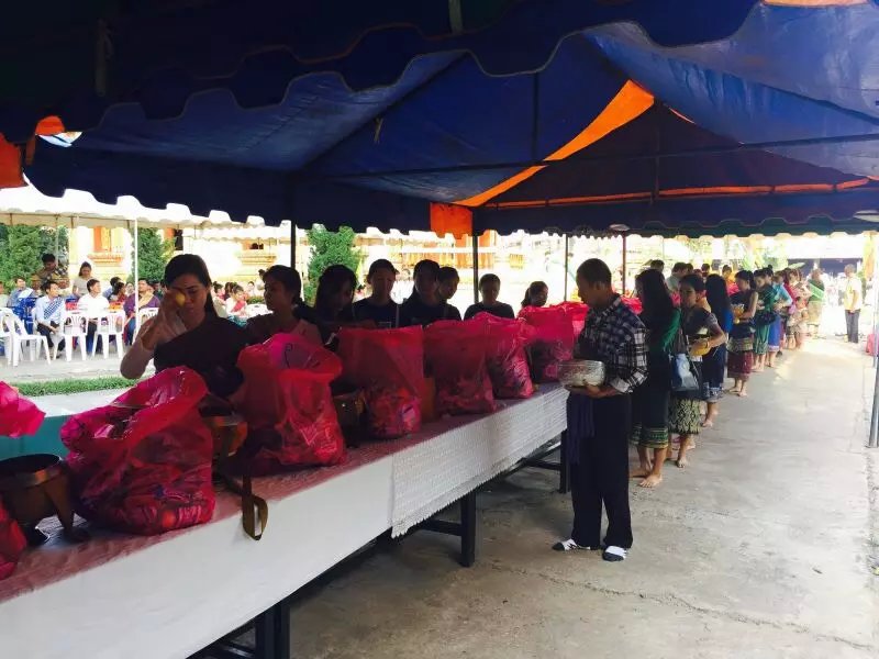 老挝出夏节清晨去寺庙布施的照片,每天清晨在路边都可以看到老挝民众在给僧侣布施,特别是在琅勃拉邦,场面尤为壮观。