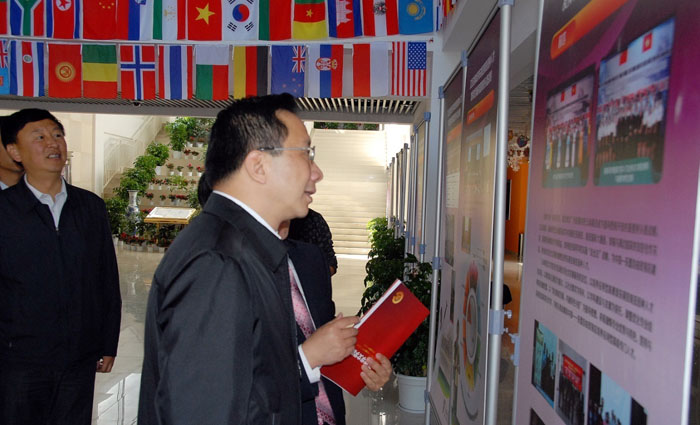 随后,高峰副省长一行参观了华文学院图书资料室,了解了小语种图书、音像资料的收集和管理工作,并饶有兴趣地与在资料室学习的华文学院学生进行亲切交谈。