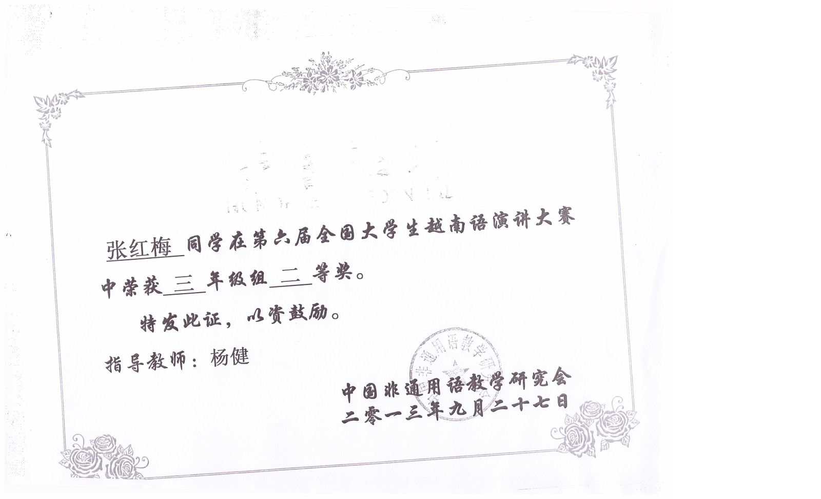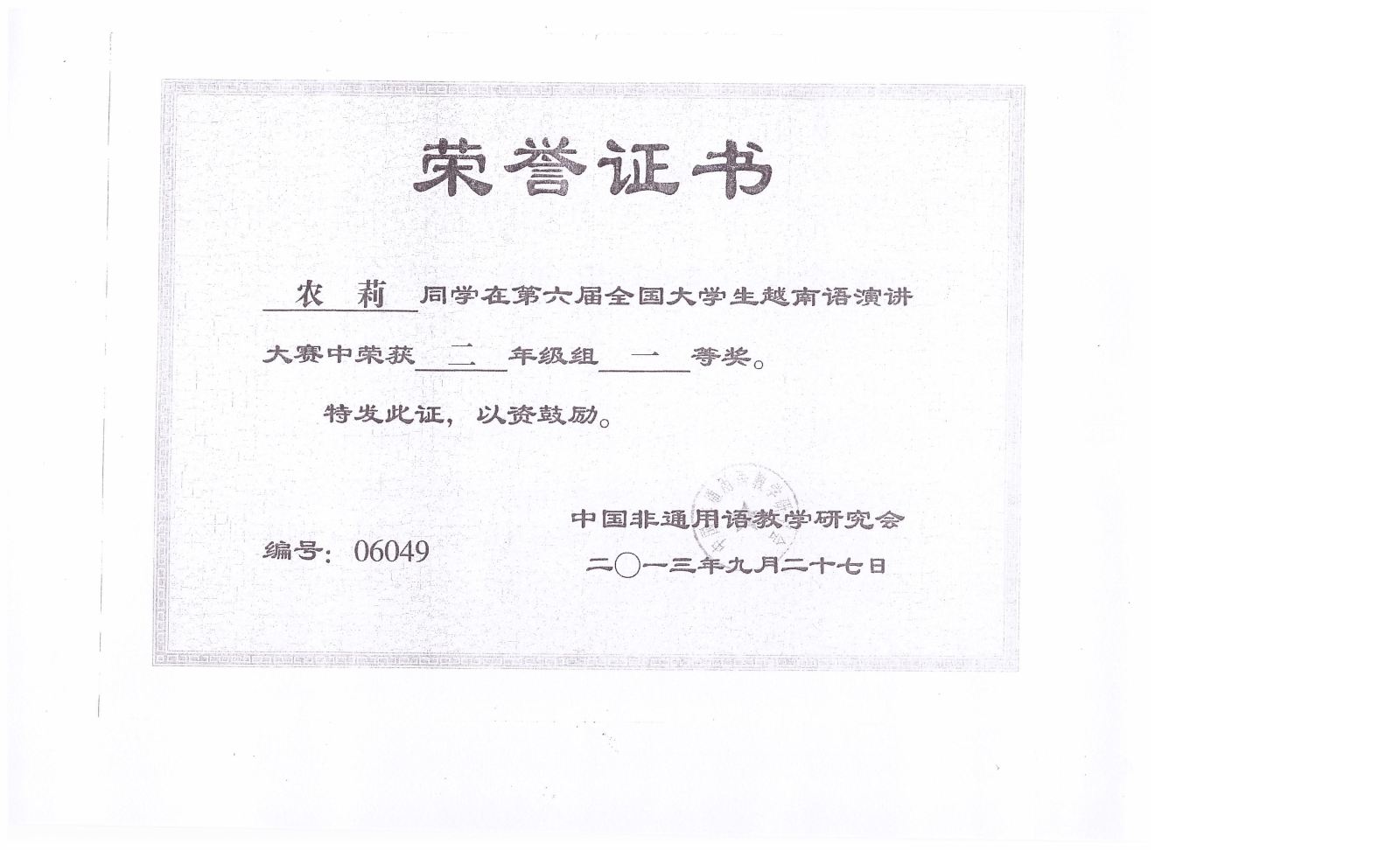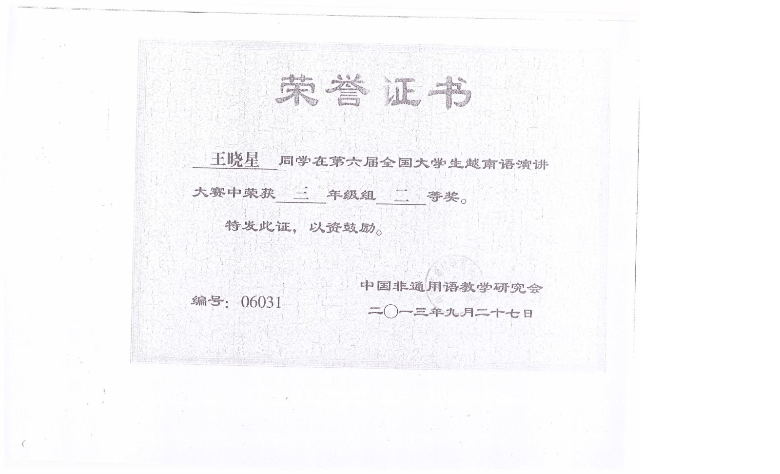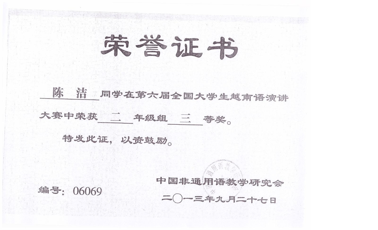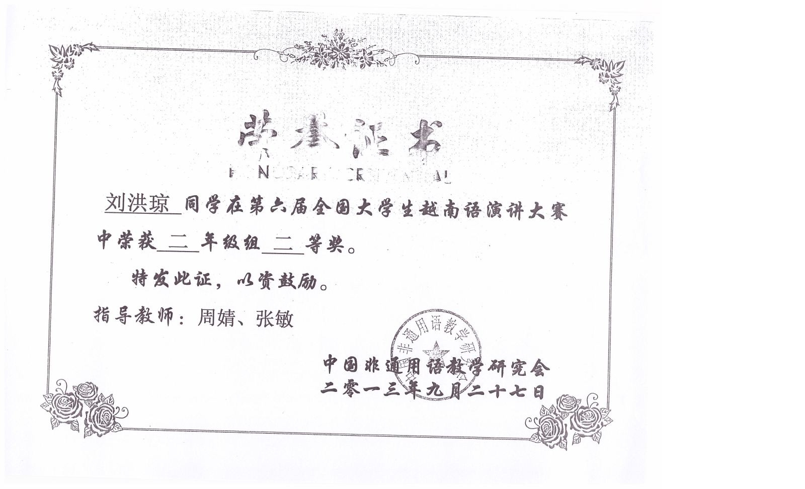 2013.9第六届全国大学生越南语演讲比赛获奖证书