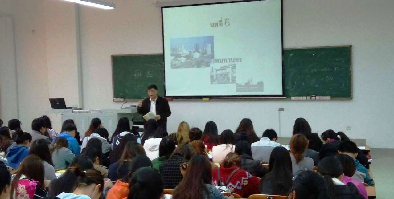 黄进炎教授凭借他多年的教学经验和翻译实践总结,为我院12级泰语专业学生讲授了《泰语翻译理论与实践》课程,课程以实用实例为核心,重点讲解了泰语翻译中常见的问题及如何提高翻译水平的方法。除此之外,黄教授还与15级学生交流了泰语学习的方法,发音技巧,用词选词规范等泰语学习难点和重点。