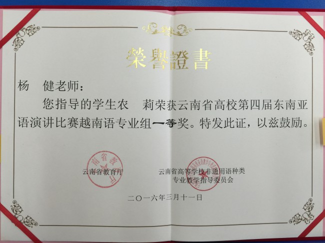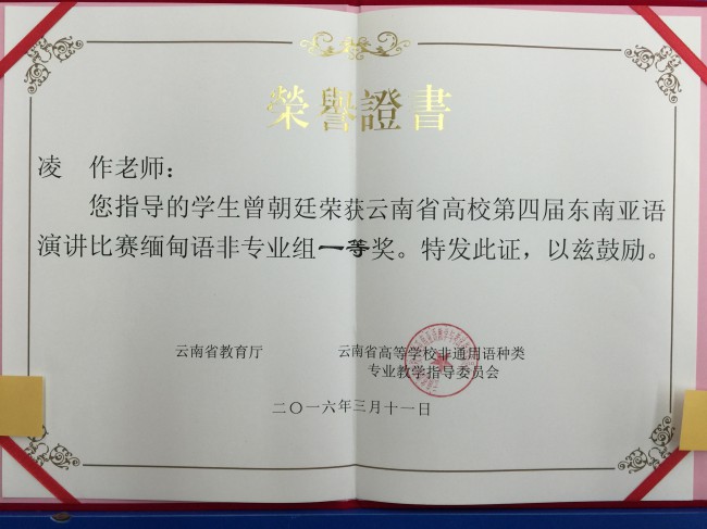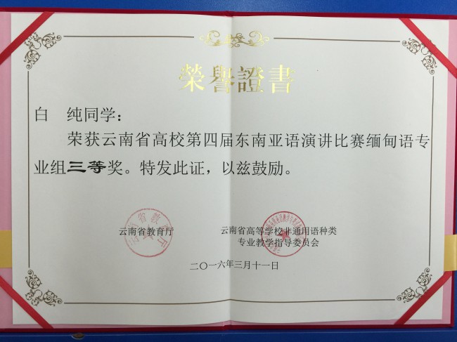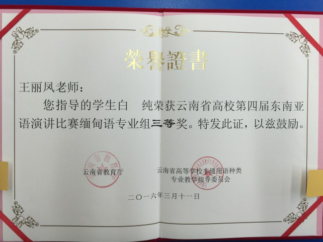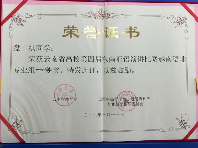 本次比赛以“一带一路·共筑云南梦”为主题,共有来自全省27所高校的68名选手参加比赛。我校6名演讲类参赛选手表现出色,荣获3个一等奖、1个二等奖和2个三等奖,创下历史最好成绩。其中,曾朝廷荣获缅甸语非专业组一等奖,农莉荣获越南语专业组一等奖,盘祺荣获越南语非专业组一等奖;段屹荣获泰语专业组二等奖;颜琳荣获泰语非专业组三等奖,白纯荣获缅甸语专业组三等奖。此外,代表我校参加大理大学宋干小姐选拔赛的吴倩文同学荣获季军。